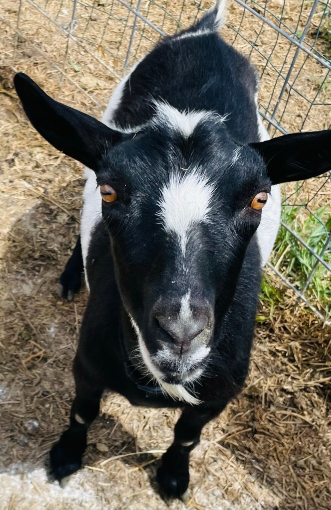 Cloudy is a first freshening 2 year old who gave us beautiful triplet does this spring 2023! She was an excellent mother and made plenty of milk for all three of her babies who grew like weeds! She can be milked and is trained to the milk stand, but her teat placement and size make hand milking somewhat of a challenge. She is best suited as a family pet or kid raising doe. She is a sweetheart and loves scratches and animal crackers! A fun fact about her is that her beard is half white and half black! She can be exposed to a buck before leaving for a fee. Selling unregistered.