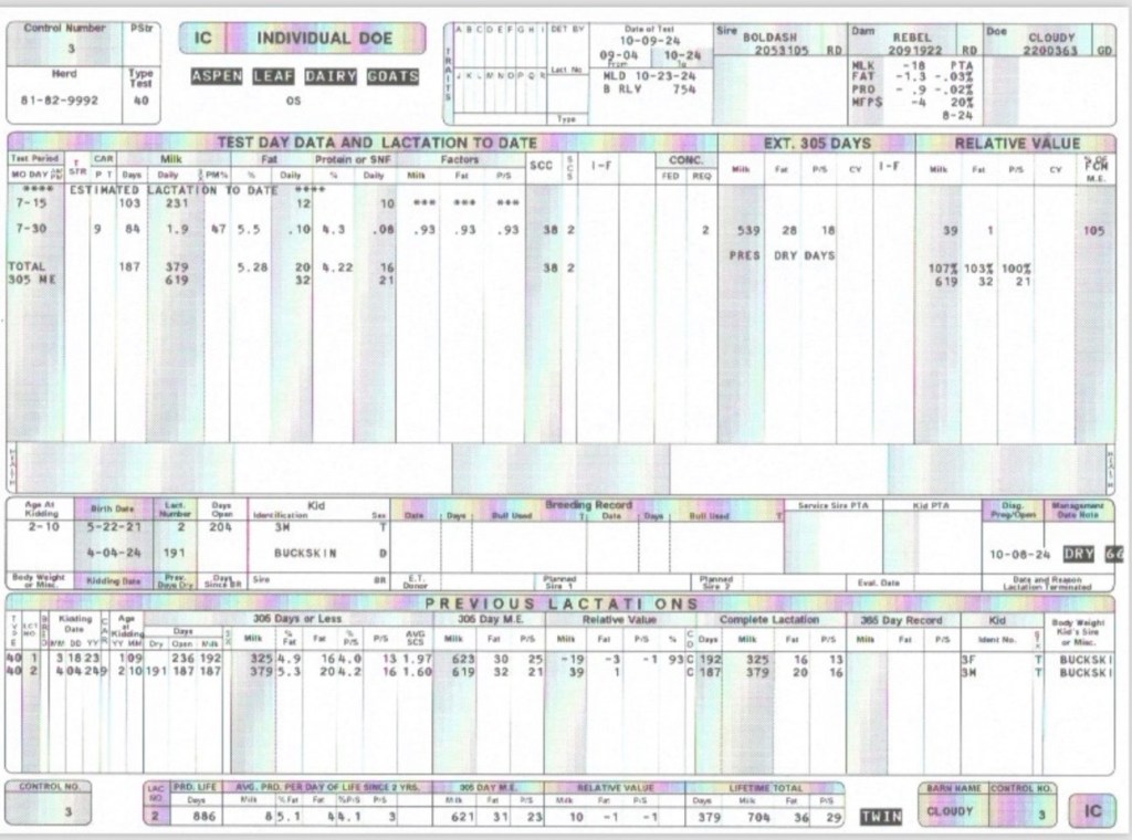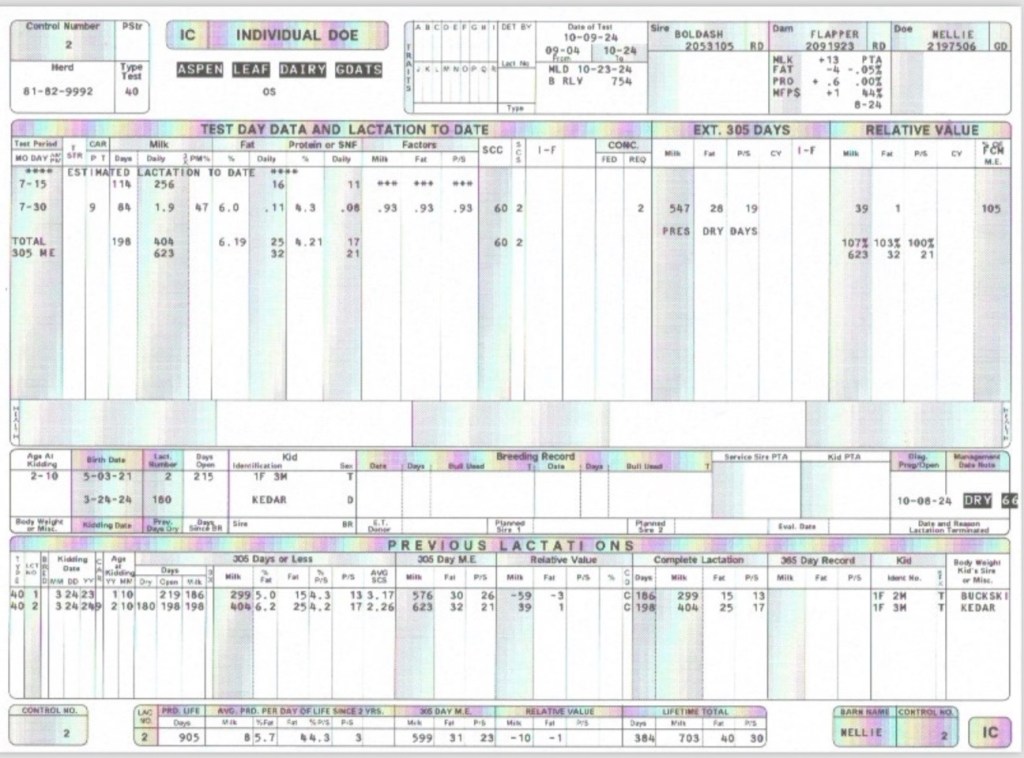 Below is the completed lactation record for each doe we had on test this year. It includes their lifetime totals from all their previous lactations at the bottom as well.