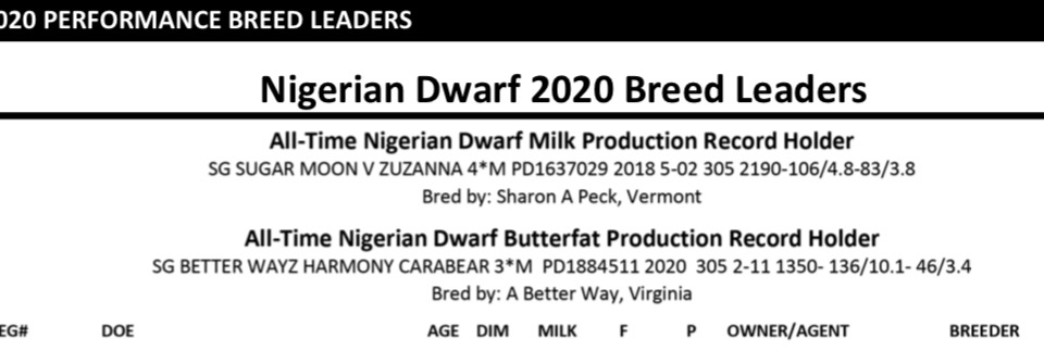 Better Wayz Augustus We’re reaching for production potential with this buck from Better Wayz farm, home of many SG and Elite does. Gus’s dam Harmony was the 2020 breed leader for butterfat production; See below. Photo courtesy of Bella Fattoria FarmHidden Palms L Blue Lotus *B This star buck has championed in show, but has not earned his permanent championship. I think he should add a lot of potential for outstanding production & gorgeous udders without sacrificing conformation. Sons will qualify for their *B, if their dam is also a*M doe. Photo Courtesy of Deena KainCH Winning Streak Molded Rose We couldn’t help but grab some semen out of this Champion buck from the notable Winning Streak Nigerians to try and seal the deal on conformation, and add a little splash of color with moonspotting as well. Photo courtesy of Jennifer Dachtonof Erinwood’s FarmOld Mountain Farm Smart Alec We hope to bring in some of the upstandingnessand style we see so consistently in the notable Old Mountain Farm herd. His sire Old MountainFarmAll-Over-It appraised EEE 91 at 3 years & 4 months. Old Mountain Farm says, “Allieparticipated in his first three shows, all in one weekend and left as a finishedchampion.” Polled(naturally hornless) kids possible Photo Courtesy of Old Mountain FarmAgape’s Prize Lennzipp CQuinn *B We snatched up an opportunity to introduce more show quality into our herd, hoping for more conformation and udder improvements with this buck who’s dam and sire both are Old Mountain Farm. His dam Zipper is a finished Champion, and his sire was ADGA 2018 1st Place Get of Sire. Sons will qualify for their *B, if their dam is also a *M doe.Photo Courtesy of Sunny Days Farm See his dam Old Mountain Farm Zipper here at Agape’s Prize.