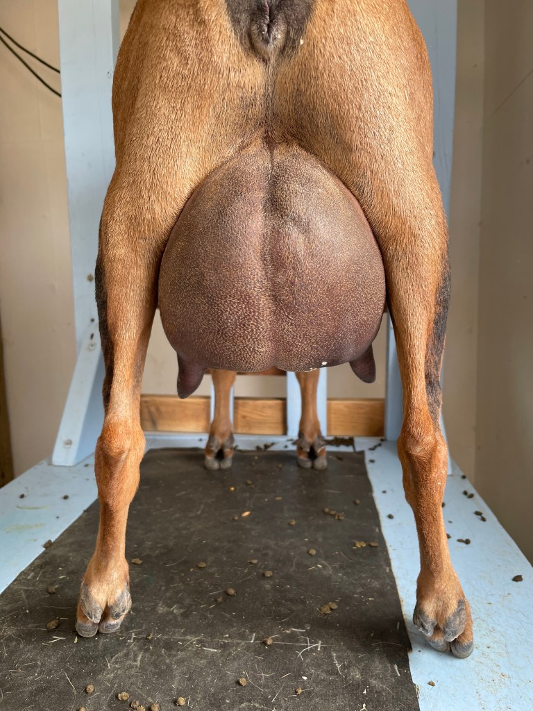 Flapper did very well on milk test as a first freshener in 2021-2022, earning her 4*M(pending since 2021). Her teat size and placement is wonderful, she is very easy to hand milk, has calm milk stand manners and is an easy keeper. I wish she had a little larger orifices, but she milks out just fine. We have three retained daughters in our herd!