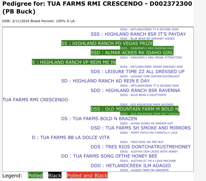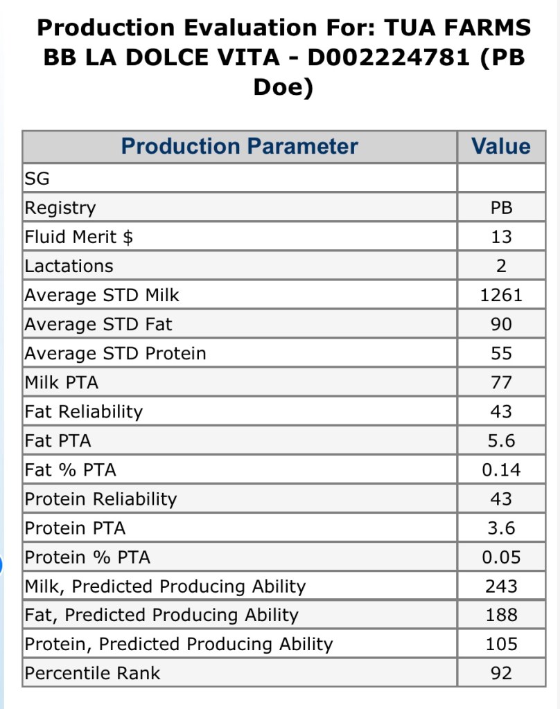 His dam, 8*M TUA FARMS BB LA Dolce Vita VEEE 90, in her second lactation (2024) produced 7# on her first milk test of the year at 28 days fresh according to CDCB milk test reports. Dolce also won a reserve champion 🏆 in 2024. She LA scored VEEE 90 in 2025! Visit her page at TUA Farms for current show wins and milk testing data.