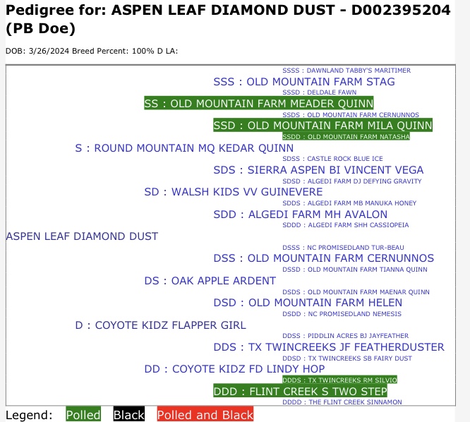Dusty is out of our best senior milking doe and sired by our ai bred buck from Round Mountain Creamery with an Old Mountain Farm sire! She has been one of our highly anticipated does to freshen and I hope for a great udder and milking ability. Her dam, Flapper, is 4*M pending.