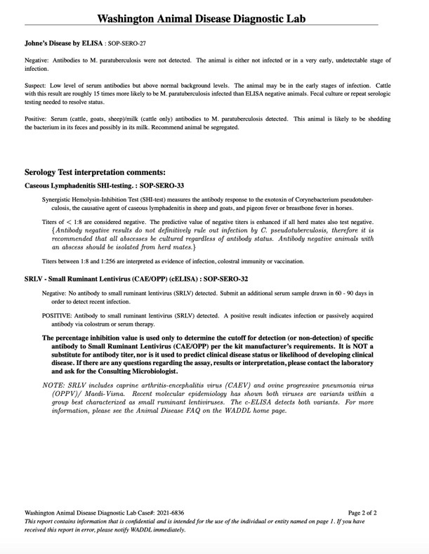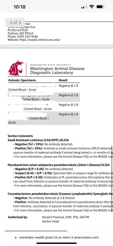 *2021 Aspen Leaf herd Test results below for the Small Ruminant Biosecurity Screen, updated 5/7/2021 Our first blood test showed that our herd is clean; Negative for CL, Johne’s, and CAE.