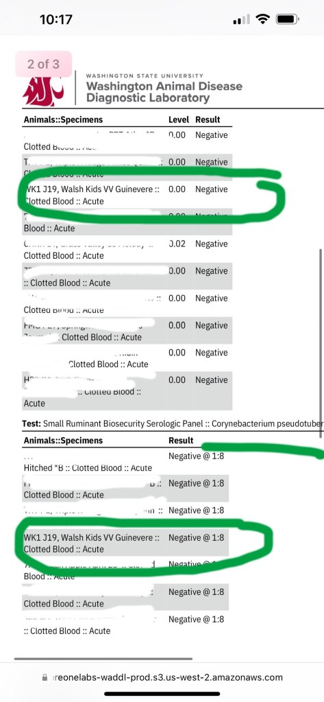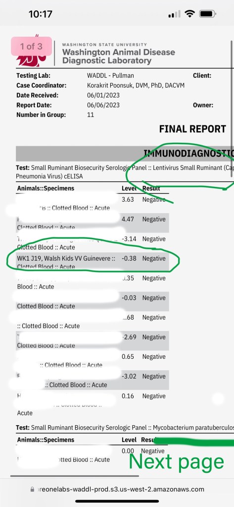 *2023 we purchased a buckling Round Mountain MQ Kedar Quinn and have his dam’s clean test results from the seller’s farm below. (Other goat’s names on test report blotted out for their privacy)