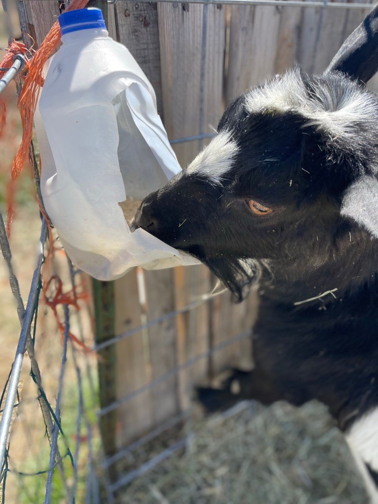 We buy our goat mineral from the SPURLINE in Livingston. We like the Payback brand in 50 lbs sacks. Contact them to order some in for you if interested, they don’t always keep it in stock. We have had good success in preventing deficiencies using this mineral paired with our other routine and occasional health supplements which includes copper bolus sometimes twice or more annually, selenium and Vitamin E oral gel several times a year or as often as monthly, B Complex oral gel as needed(especially after heavy herbal dewormer dosing). Sometimes we offer them fresh tree branches(especially willow and short needle pine), fresh alfalfa, fresh raspberry leaves, fresh herbs; all these things help add variety and natural minerals into their diet as well. We find that especially in springtime after kidding and when they are shedding their winter undercoat, they really slick up the minerals. Summer to early winter, not so much, but we still offer them free choice year round. Here’s some info about mineral deficiencies and their symptoms from Weed em and Reap . More about minerals > Mineral 101. A simple way to provide minerals so that they won’t waste it and poop in it, is to hang a gallon jug with a small hole cut out on the side just big enough to get their noses into, and hang it on the fence at the goat’s eye level. If they rub it with their heads, it won’t spill, just tips up. Add fresh mineral weekly or daily as they consume it.